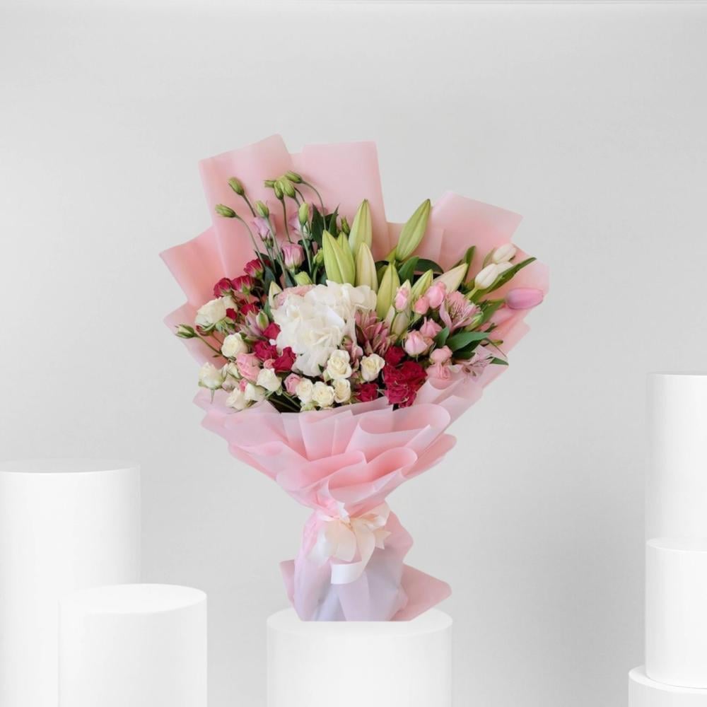 تقدم لكم باقة الورد الوردية الفاخرة، التي تتميز بتنوع ألوانها وجمال تنسيقها. تحتوي على توليفة من الزهور الرقيقة مثل التوليب، الليليوم، الورد الجوري، وزهور الأوركيد، مما يجعلها الاختيار المثالي لإضفاء لمسة من الأناقة والانتعاش على أي مناسبة. يتم تغليف الباقة بورق هدايا وردي فاخر، مما يضيف لمسة من الرقي والاحترافية في التعبير عن مشاعرك.