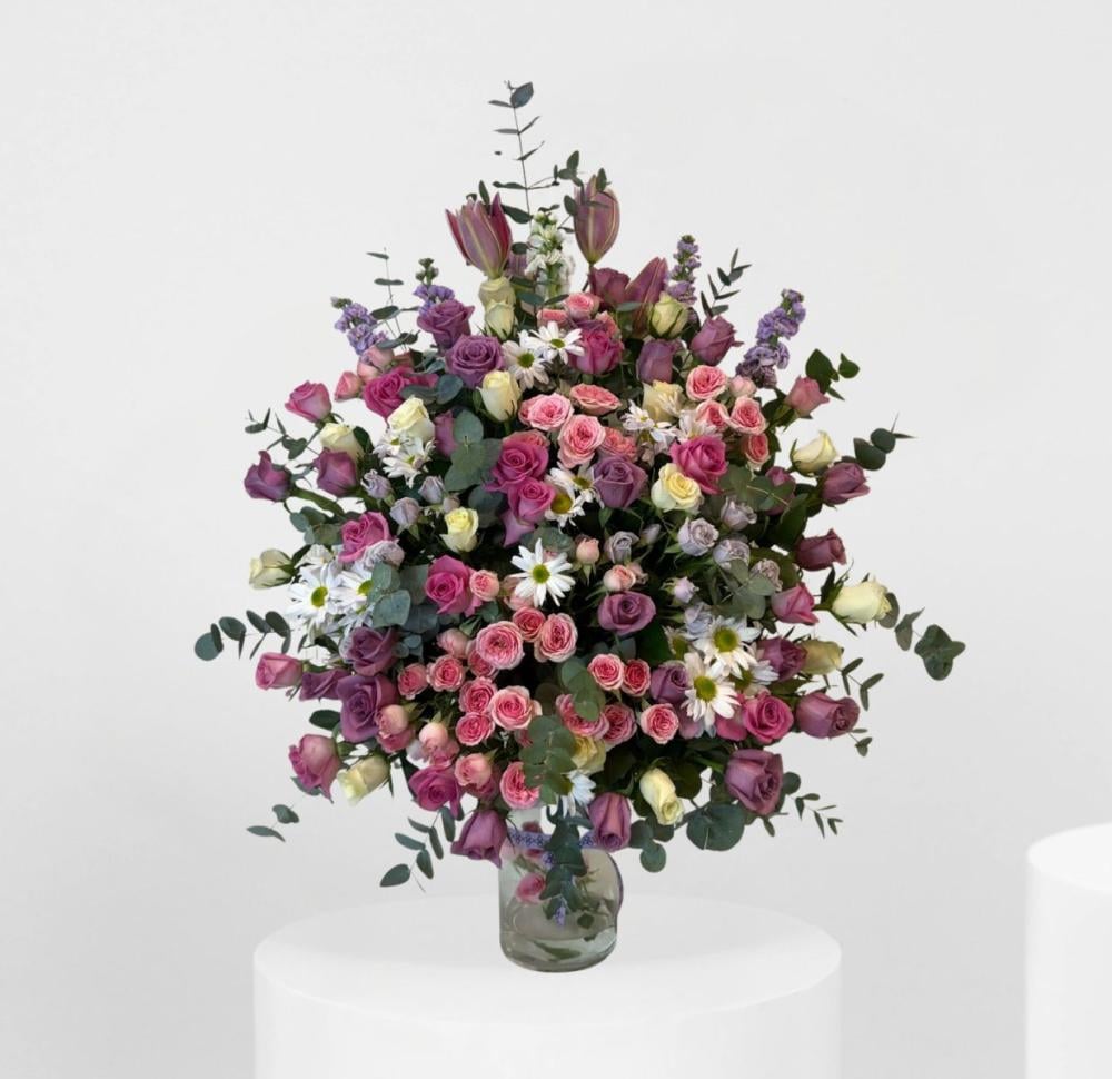 باقة فاخرة من الورود المتنوعة التي تجمع بين الجمال والأناقة، مُعززة بألوان متنوعة من الورد الوردي والبنفسجي والأصفر، ممزوجة بلمسات من الأقحوان الأبيض الرائع. الأزهار محاطة بأوراق الأوكاليبتوس الخضراء التي تضيف لمسة من الانتعاش. تعد هذه الباقة مثالية للتعبير عن الحب والإعجاب أو لتزيين المناسبات الخاصة. يأتي المنتج في مزهرية أنيقة لتعكس لمسة من الفخامة والرفاهية